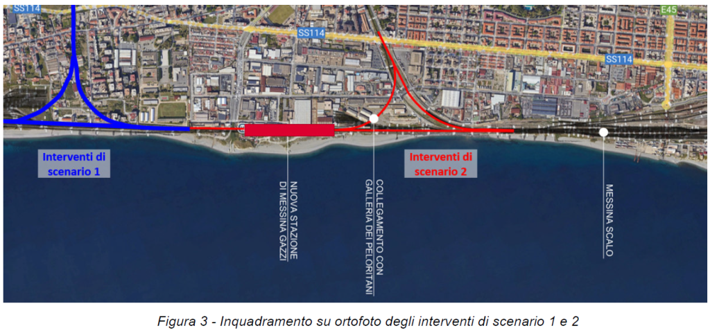 Lo scenario 1 è l’oggetto del presente Progetto Preliminare e verrà meglio dettagliato nel prosieguo di questo documento mentre lo scenario 2 sarà oggetto di una successiva separata progettazione.Si forniscono appresso alcuni cenni sullo scenario 2 al fine di offrire un inquadramento più generale degli interventi.Come già accennato lo scenario 2 prevede un collegamento diretto del Ponte verso Palermo; a tal fine si prevede la realizzazione di un’apposita bretella nella zona di Messina Gazzi che permetterà di indirizzare i treni provenienti dal Ponte direttamente verso la galleria dei Peloritani immettendoli dunque sull’attuale linea Messina Palermo. In questa stessa zona, in corrispondenza dell’attuale fermata Messina Gazzi, si prevede la realizzazione della nuova omonima stazione per il servizio viaggiatori.