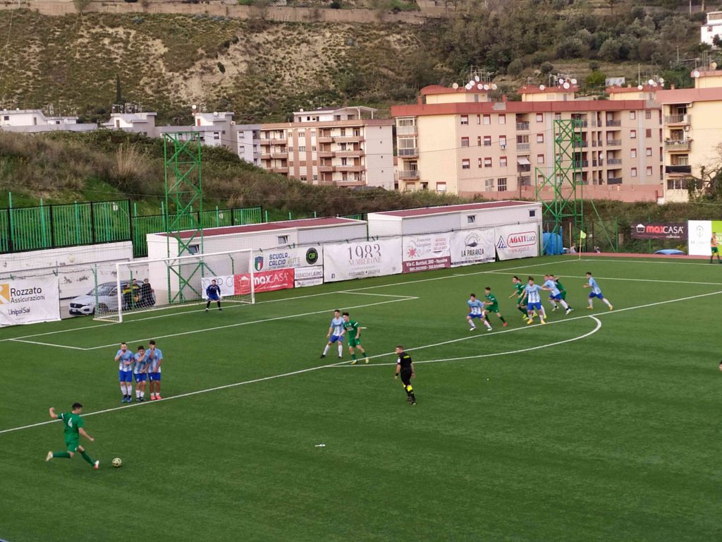 I padroni di casa controllano il match, ma nel momento migliore vengono colpiti dal Città di Calatabiano: al 38′ cross da sinistra di Santitto e girata al volo di Tomasello per lo 0-1 che punisce oltremodo i biancoverdi e chiude la prima frazione.