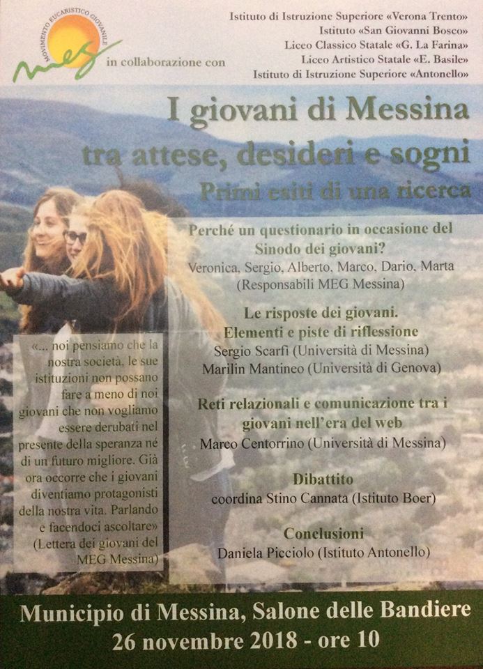 “I giovani a Messina tra attese, desideri e sogni. Primi esiti di una ricerca”. È questo l’eloquente titolo di un incontro promosso dal Movimento eucaristico giovanile (Meg) di Messina, l’organizzazione facente capo ai Gesuiti in Italia, in collaborazione con gli istituti di istruzione superiore Verona Trento, San Giovanni Bosco, Liceo G. La Farina, Liceo E. Basile e Istituto Antonello.