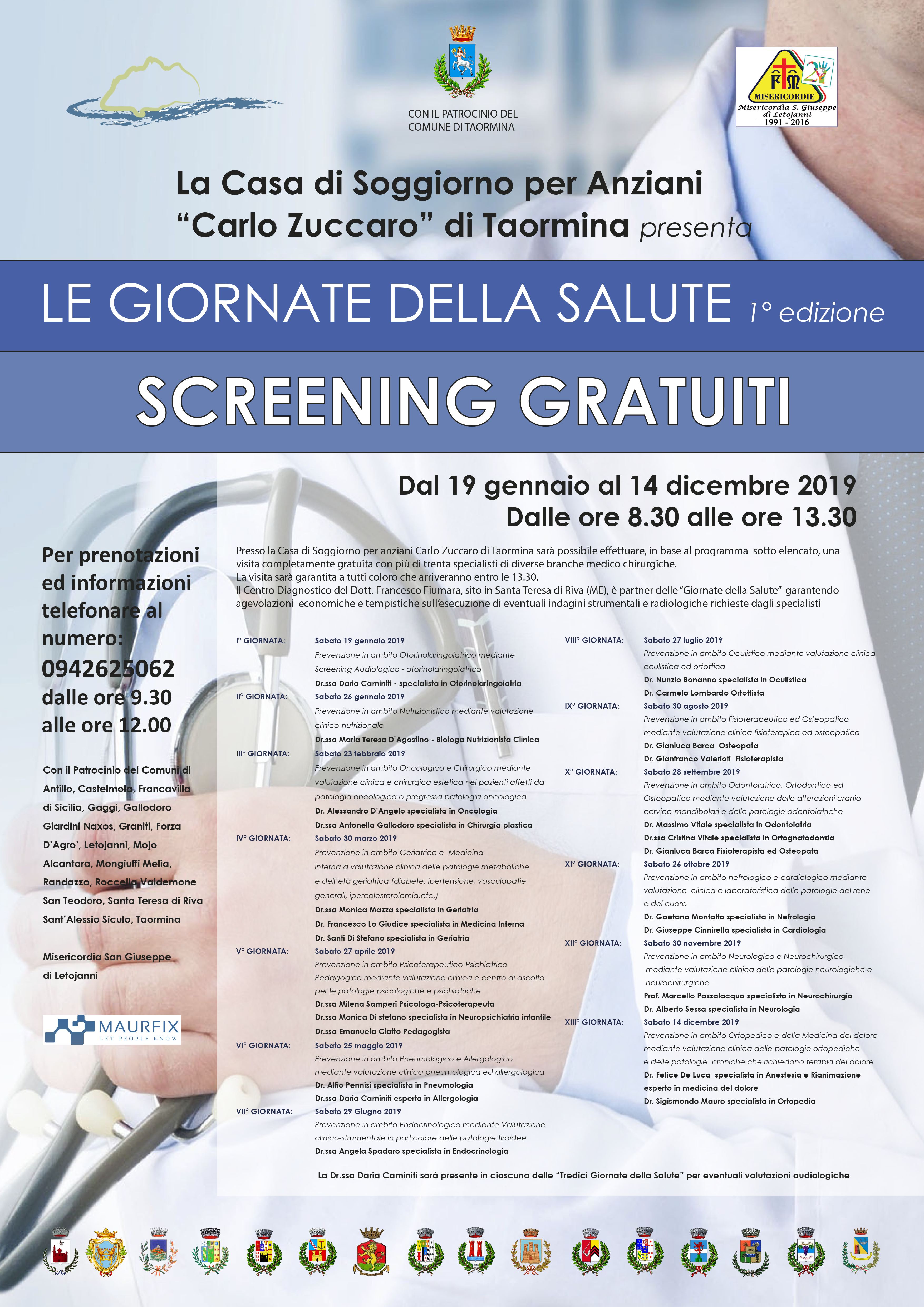 Le Giornate della Salute hanno ottenuto il patrocinio della Fraternita Misericordia “San Giuseppe” di Letojanni e dei comuni di Taormina, Antillo, Castelmola, Francavilla di Sicilia, Gaggi, Gallodoro, Giardini Naxos, Graniti, Forza d’Agrò, Letojanni, Mojo Alcantara, Mongiuffi Melia, Randazzo, Roccella Valdemone, San Teodoro, Santa Teresa di Riva, Sant’Alessio Siculo. Media partner delle “Giornate della Salute” è la Maurfix Srl, agenzia di comunicazione e strategia digitale di Roma, con sede operativa anche a Taormina (www.maurfix.it).