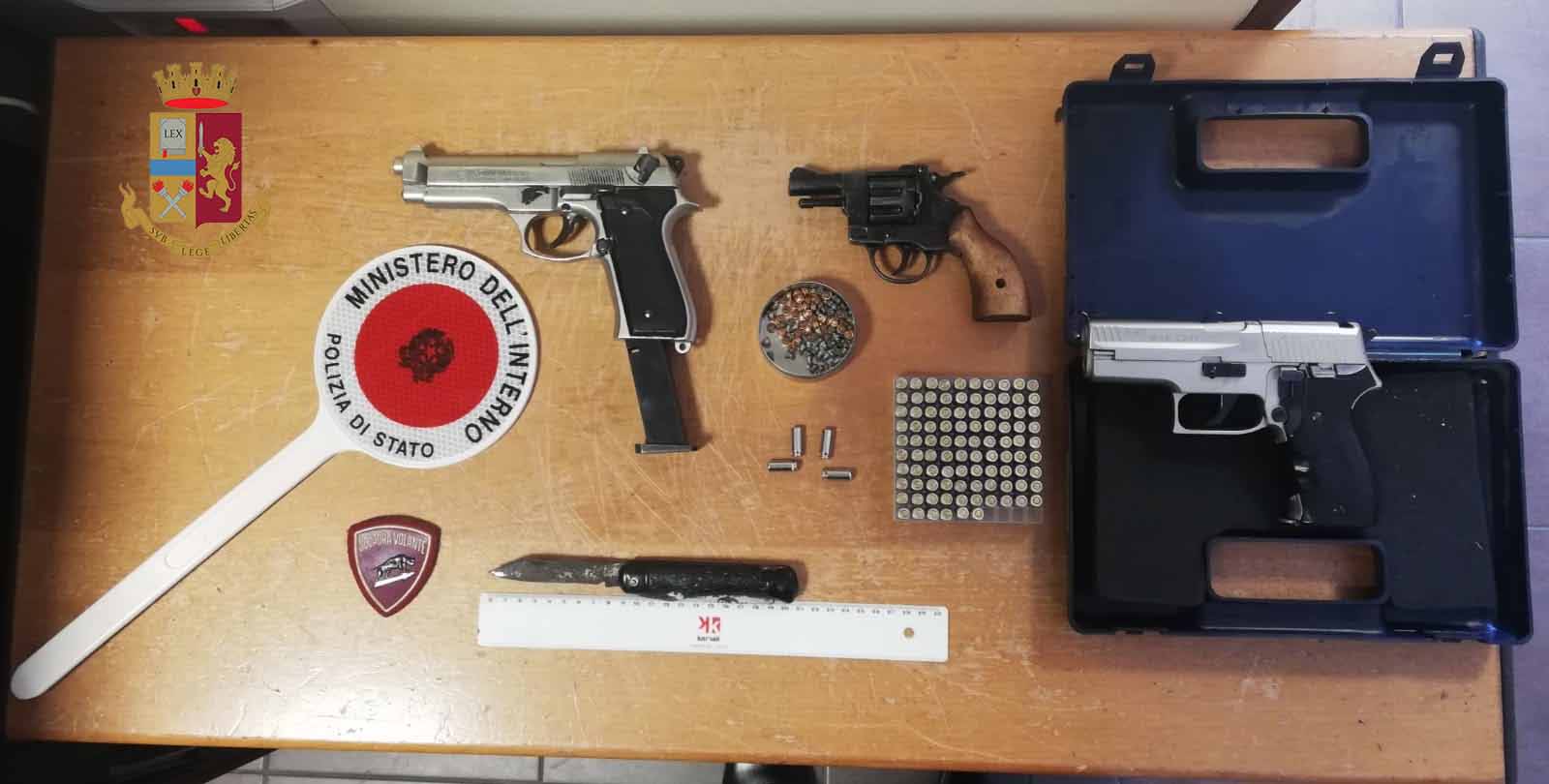Il sessantacinquenne ha consegnato spontaneamente una pistola a tamburo a salve con relativo tappo rosso e un coltello lungo 20 centimetri che teneva nel borsello. La successiva perquisizione portava al rinvenimento di un’altra pistola calibro 8, anche questa con tappo rosso, con relativo caricatore e circa 100 cartucce che l’uomo custodiva in un’altra borsa a tracolla. Si è ritenuto necessario, quindi, fare un’ulteriore perquisizione, stavolta presso l’abitazione dell’uomo, all’interno della quale i poliziotti hanno rinvenuto una terza pistola ad aria compressa, una quarantina di piombini ed altrettante cartucce per pistola a salve.