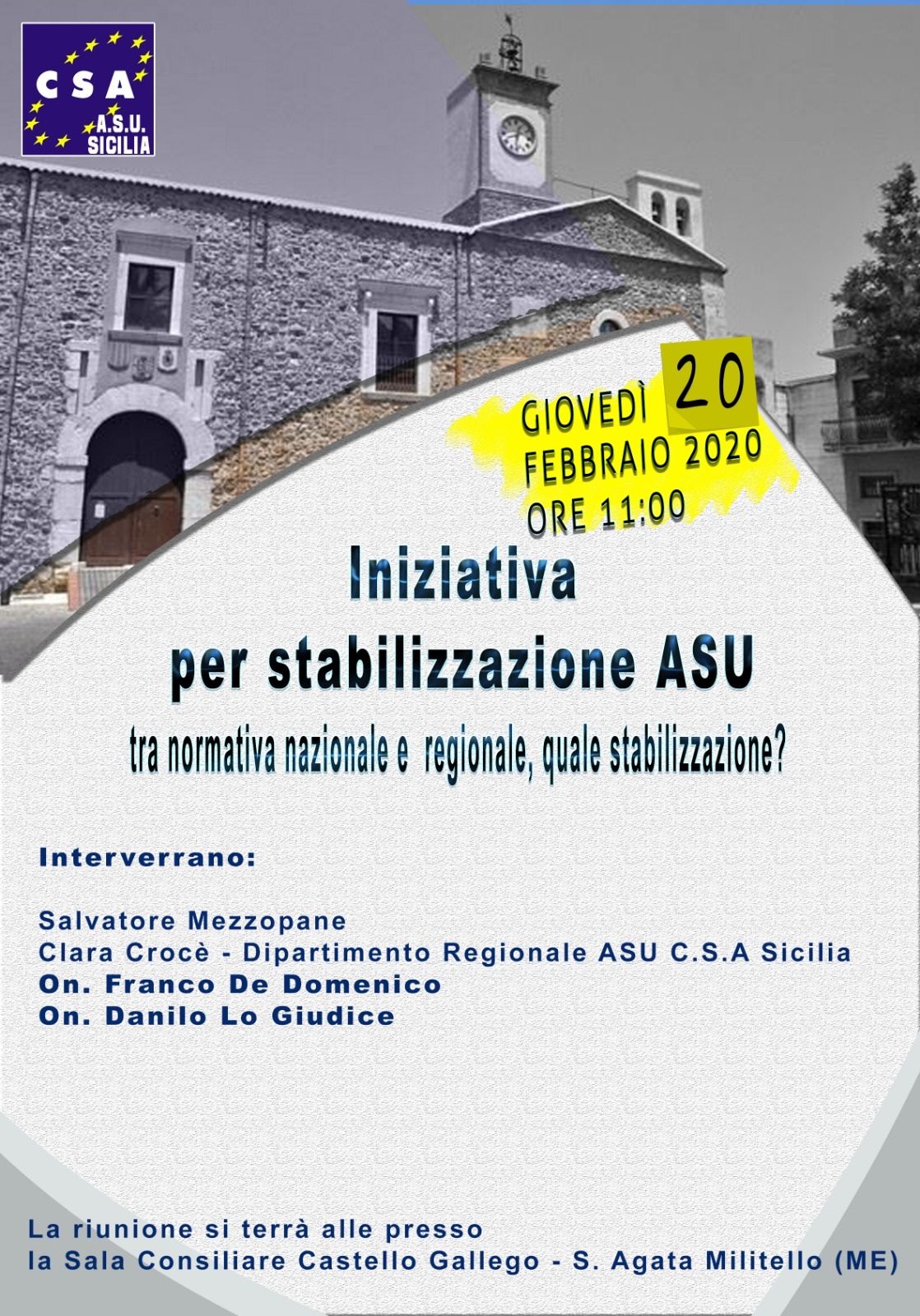 “Tra normativa nazionale e regionale, quale stabilizzazione per gli Asu?”. Questo il tema dell’incontro organizzato dalla Csa Asu Sicilia per domani, giovedì 20 febbraio, alle 11 nella Sala Consiliare del Castello Gallego a Sant’Agata Militello. Saranno presenti Salvatore Mezzopane (Csa), Clara Crocè (Dipartimento regionale Csa Asu Sicilia), Franco De Domenico (parlamentare Ars del Pd) e Danilo Lo Giudice (parlamentare Ars dell’Udc).