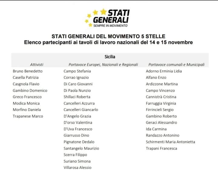Volgendo lo sguardo sull’Isola, i rappresentanti della Sicilia agli stati generali formano uno dei gruppi regionali più numerosi, se non addirittura il più numeroso. Tra i big di Messina troviamo il questore della Camera dei Deputati Francesco D’Uva, il sottosegretario del Ministero dell’Economia e delle Finanze Alessio Villarosa e la senatrice Grazia D’Angelo. A livello comunale, invece, è presente la consigliera comunale Cristina Cannistrà e il vicepresidente della III Circoscrizione Alessandro Geraci.