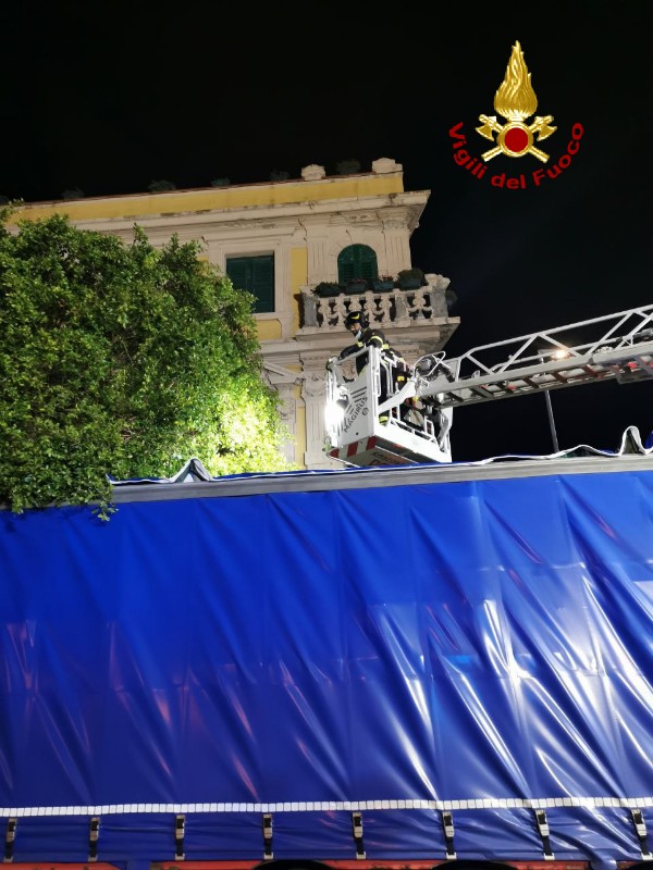 Nottata movimentata per i vigili del fuoco del Comando di Messina. Un autoarticolato è rimasto incastrato tra i rami di alcuni alberi.