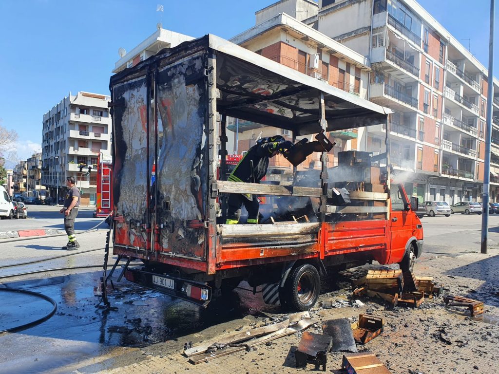 Il rogo di un furgone carico di cassette di legno, quindi facilmente infiammabili, ha impegnato per quasi un’ora due squadre dei vigili del fuoco.