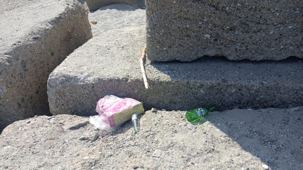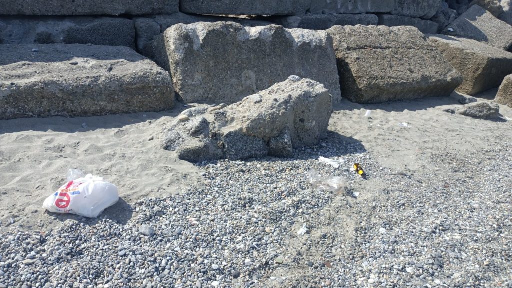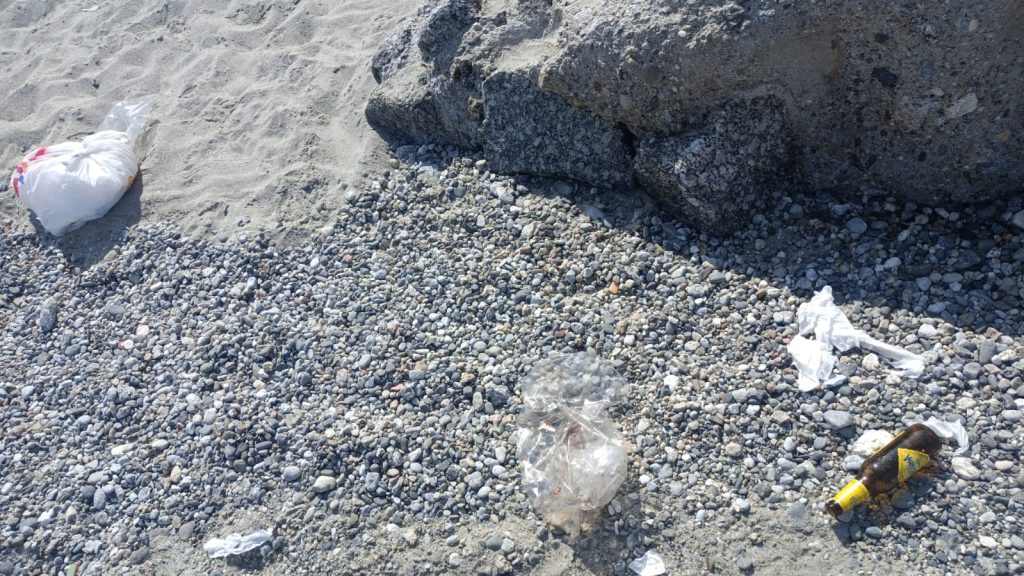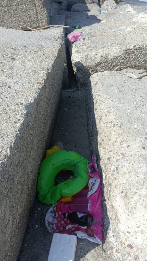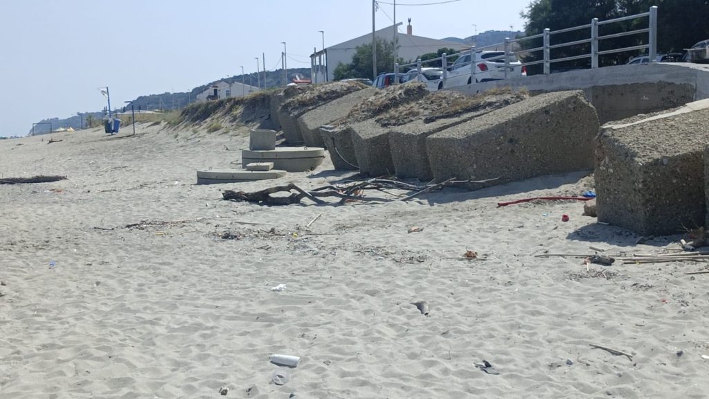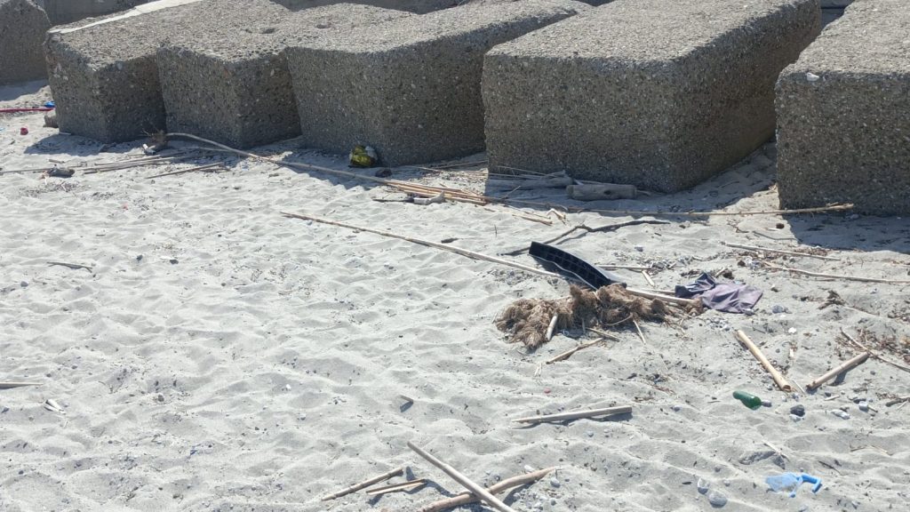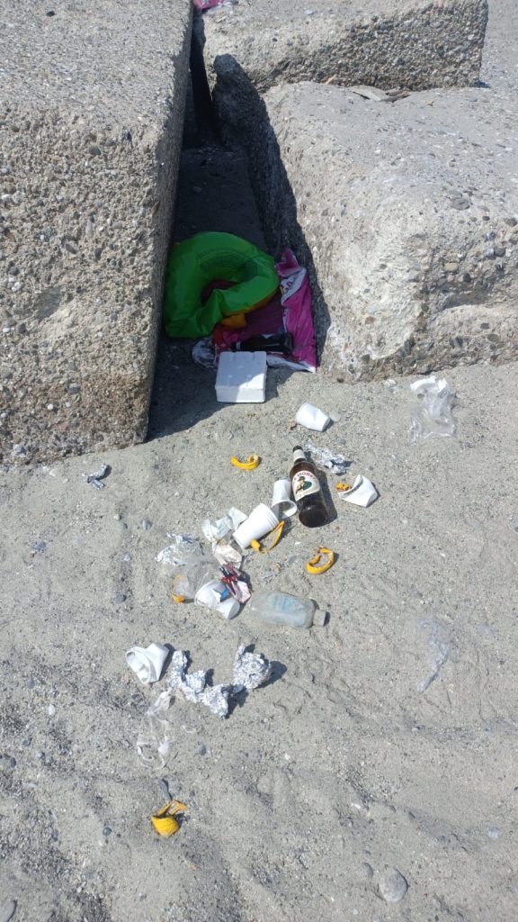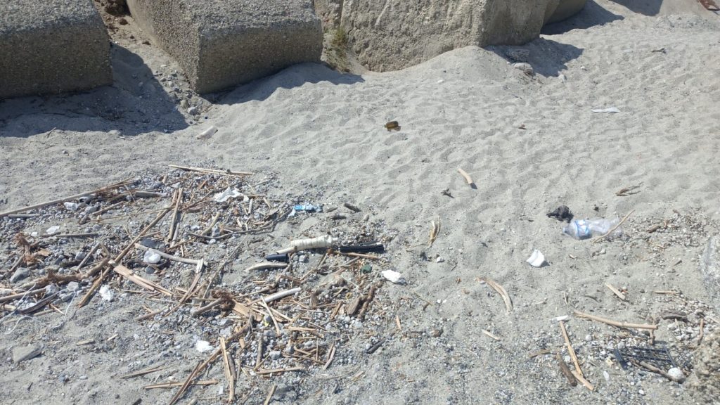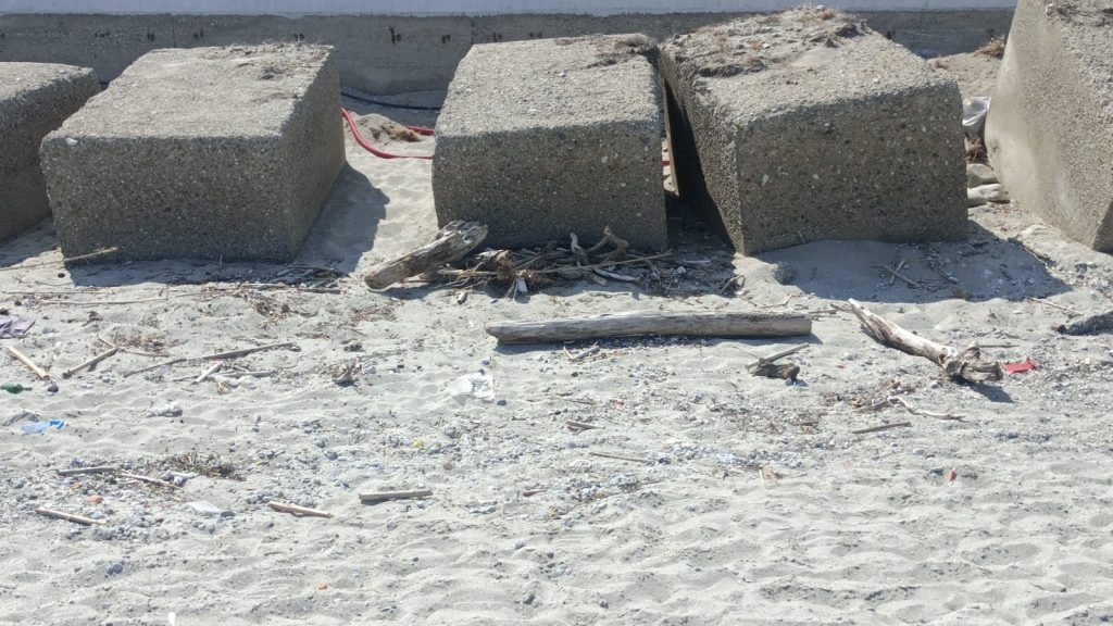 La splendida spiaggia nelle adiacenze dell’Ex Lido Marmora Beach, nei pressi del Torrente Marmora, è completamente lasciata all’abbandono e preda degli incivili, che gettano rifiuti di ogni tipo, carte, plastiche, bottiglie di vetro, persino salvagenti per bambini e materassini.