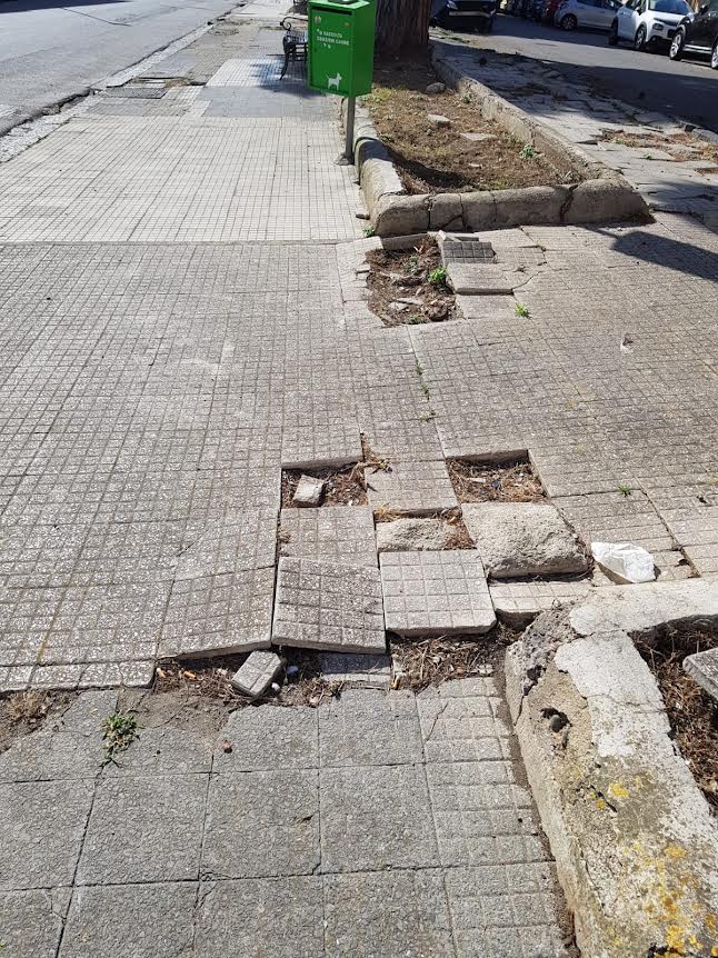 Il marciapiede è talmente sconnesso a causa delle radici degli alberi che i pedoni rischiano di inciampare. Trattandosi soprattutto di persone anziane, il consigliere della V Circoscrizione, Giovanni Bucalo, lancia l’ennesimo allarme.