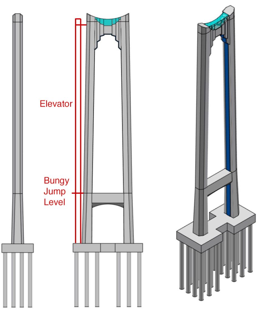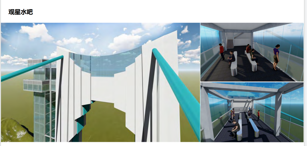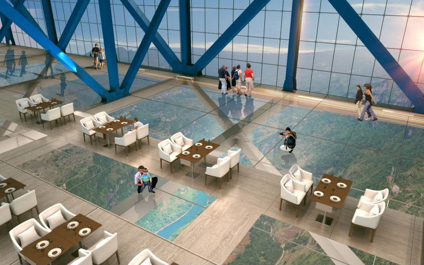 🔹 L’ascensore lascerà gli ospiti sotto l’impalcato stradale all’interno della capriata ove saranno accolti da un promenade con pavimento in vetro lunga 800 m, gli ospiti letteralmente potranno fluttuare lungo questa passarella da 224 m a 404 m di altezza.