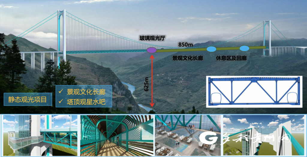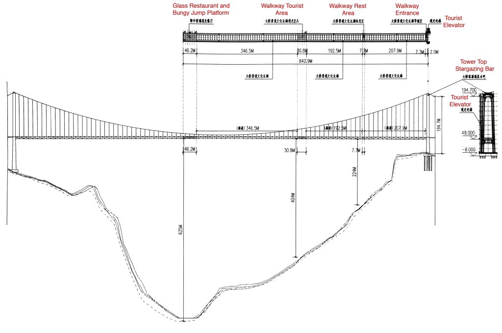 🔹 A 620 m sopra il fiume Beipan una passarella a traliccio porta gli ospiti sull’ultima piattaforma ove si potrà fare il Bungy Jump più alto del mondo.