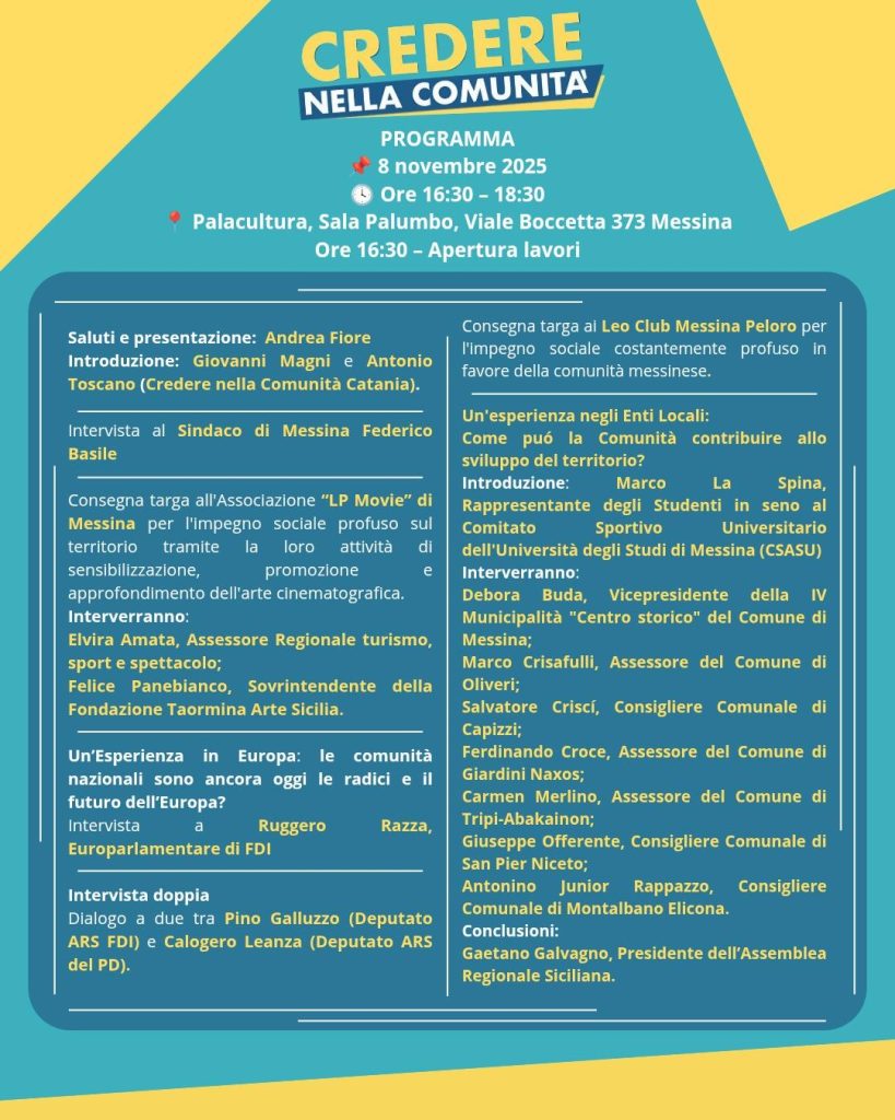 L’europarlamentare Ruggero Razza parlerà dell’esperienza in Europa e darà una risposta ad una domanda di stringente attualità: le comunità nazionali sono ancora oggi le radici del futuro dell’Europa. Seguirà una intervista doppia con Pino Galluzzo, deputato regionale di Fdi, e Calogero Leanza, deputato all’Ars del Pd. Il ricco ed articolato programma prevede la consegna di una targa al Leo Club Messina Peloro per il costante impegno sociale e quindi una serie di interventi che avranno come focus gli Enti Locali. Il tema portante della seconda parte dei lavori sarà: “Come può una Comnunità contribuire allo sviluppo del territorio?”.