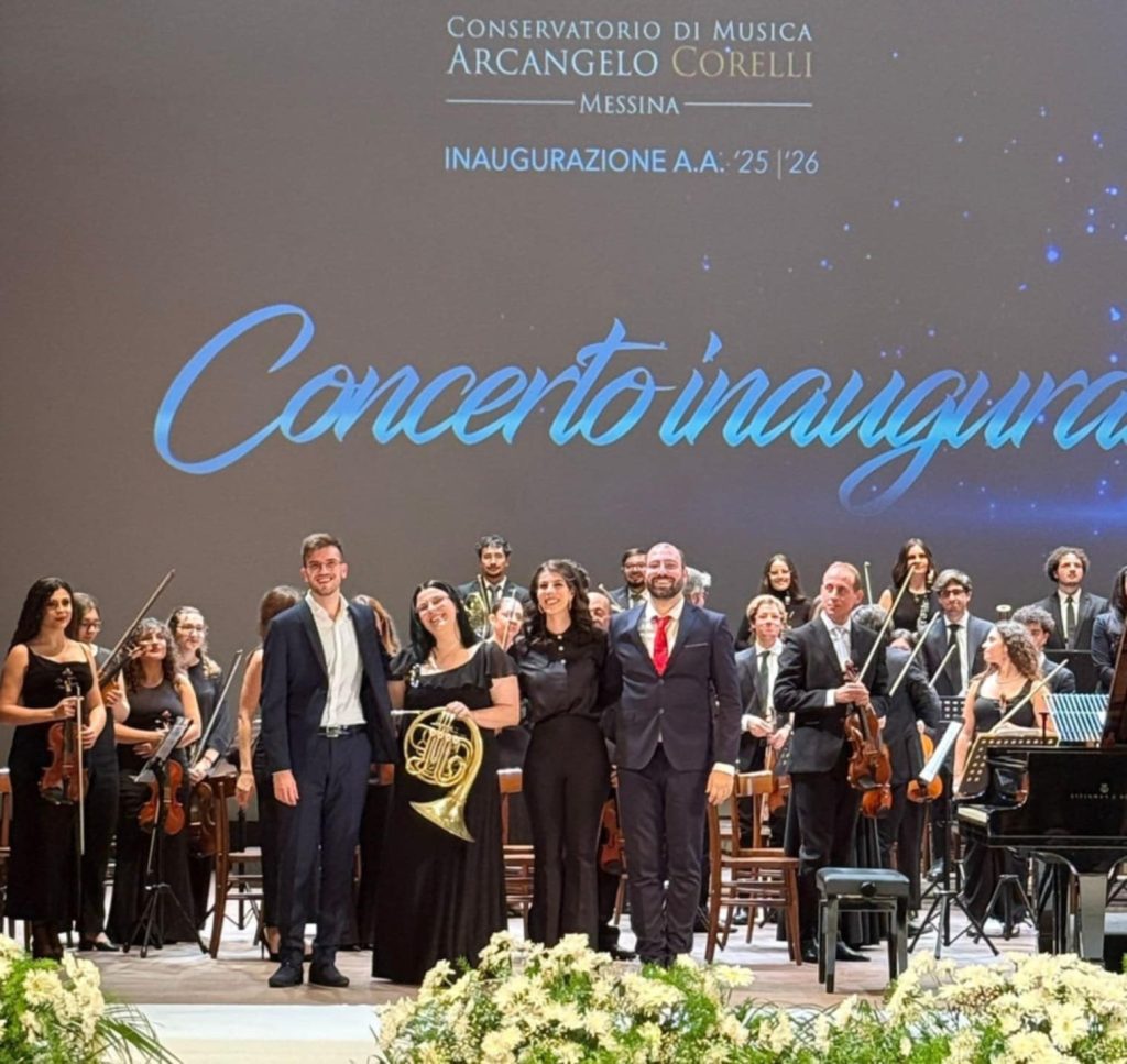 Il concerto dell’Orchestra sinfonica del Conservatorio Corelli di Messina, tenutosi in un gremito Teatro Vittorio Emanuele, ha concluso le iniziative per l’inaugurazione dell’anno accademico 2025/2026 dell’istituto di Alta Formazione Artistica e Musicale. Per la prima volta, ed è stata questa la gradita novità fortemente voluta dalla governance e dal corpo accademico del Conservatorio, a dirigere il concerto inaugurale sono stati due studenti del corso di direzione d’orchestra, Coralie Camuti e Antonio Scandurra, che hanno dimostrato eccellente preparazione ed altrettanta passione, così come i solisti Maria Chiara Giordano (al corno) e Andrea Cannata (pianoforte). Se gli applausi del pubblico all’Orchestra sinfonica hanno scandito la conclusione della cerimonia d’inaugurazione dell’anno accademico, la prima parte è stata dedicata ai bilanci ed alle nuove sfide, ai traguardi raggiunti ed ai prossimi progetti, del Conservatorio Corelli.