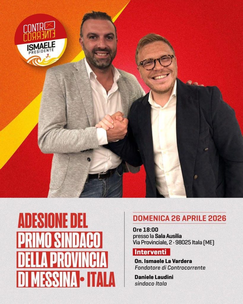 Daniele Laudini, sindaco di Itala, lascia Cateno De Luca per aderire al progetto politico di Ismaele La Vardera. L’annuncio lo ha dato lo stesso leader di “Controcorrente”, il quale ha dato appuntamento al 26 aprile 2026 per un incontro pubblico che si terrà proprio nel Comune dello Jonio.