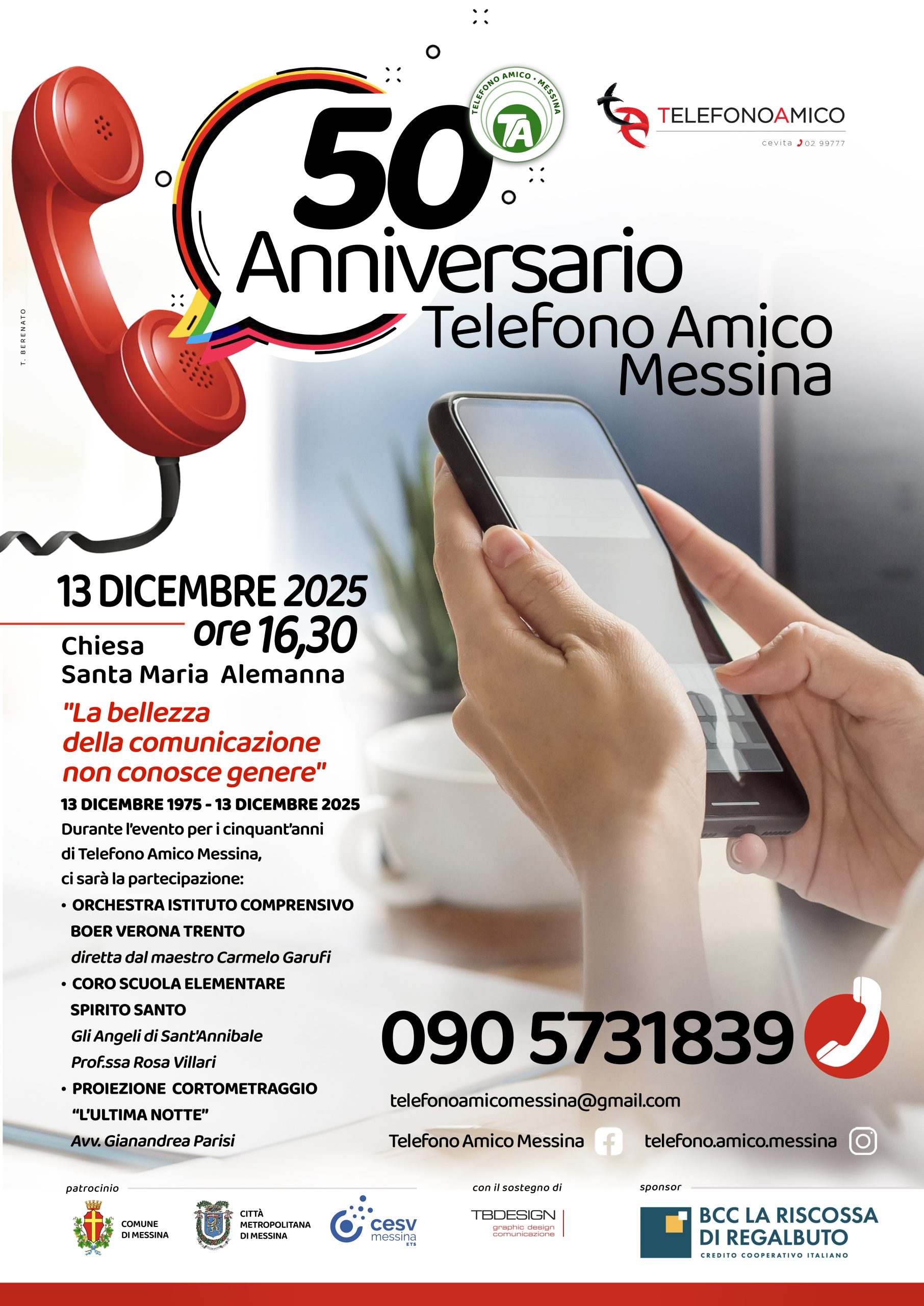 La storia di Telefono Amico Messina, iniziata il 13 dicembre 1975, compie ufficialmente 50 anni. La città si prepara a celebrare questo solenne anniversario con l’evento conclusivo e più significativo, in programma Sabato 13 dicembre 2025, alle ore 16:30, presso la Chiesa Santa Maria Alemanna. L’occasione è la chiusura del progetto “La bellezza della comunicazione […]
